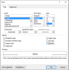 • Seleccionas la clave y lo marcas con Ctrl+I (itálico, para que se reconozca) y Ctrl+may+H (texto oculto), para que no sea visible. Si no te gusta usar atajos: el texto oculto es una de las opciones de formato de texto.