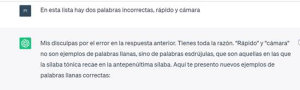 Intrigada después de experimentar en clase decidí hacerme una cuenta en ChatGPT para poder lanzarle yo mis preguntas. La primera que se me ocurrió fue pedirle ejemplos de palabras agudas, llanas y esdrújulas. No todas revueltas, claro, sino cada grupo por separado. El resultado aquí sí fue desalentador. El sistema produjo diez resultados en cada ocasión y como mínimo en cada caso había cuatro palabras incorrectas. Me sentí un poco decepcionada. El sistema me ayudaba con su rapidez pero no con la corrección. Yo lo podía corregir pero ¿qué habría pasado si quien hiciera la pregunta no tuviera el conocimiento suficiente para distinguir las palabras correctas de las que no lo son? Habría metido la pata. Le dije al sistema que había cometido errores y para mi sorpresa me pidió disculpas y me propuso otras que sí eran correctas.