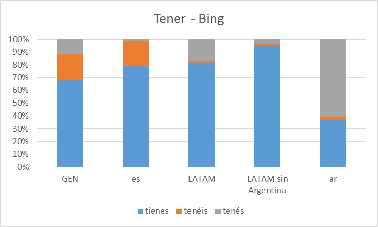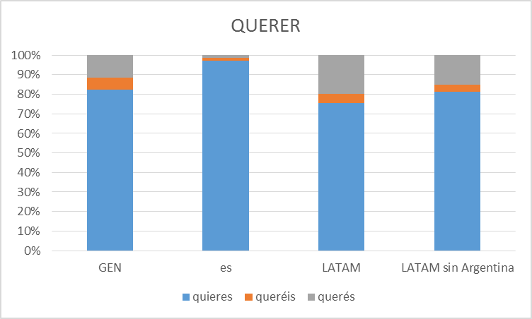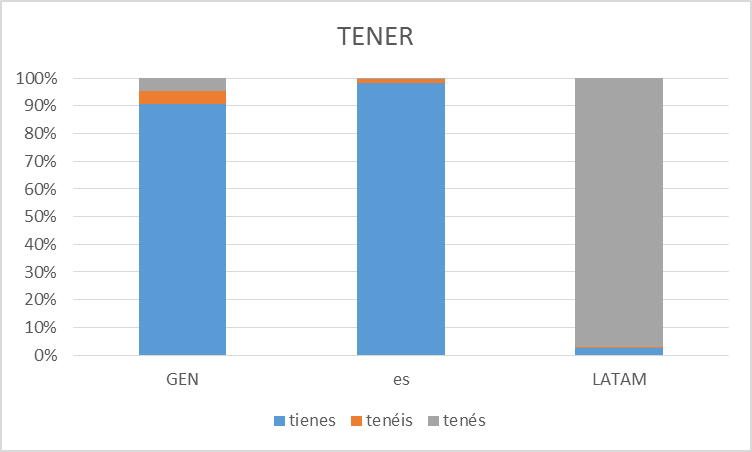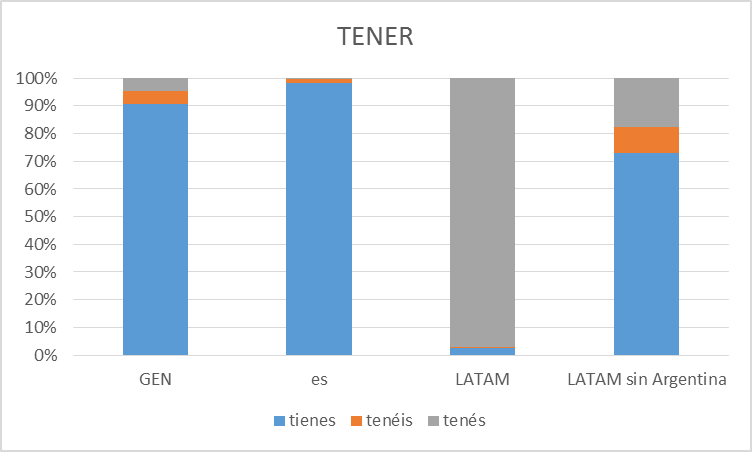 Si se reformulan los datos en porcentajes, recalculando todo para que los datos de cada forma verbal sume 100%, obtenemos :